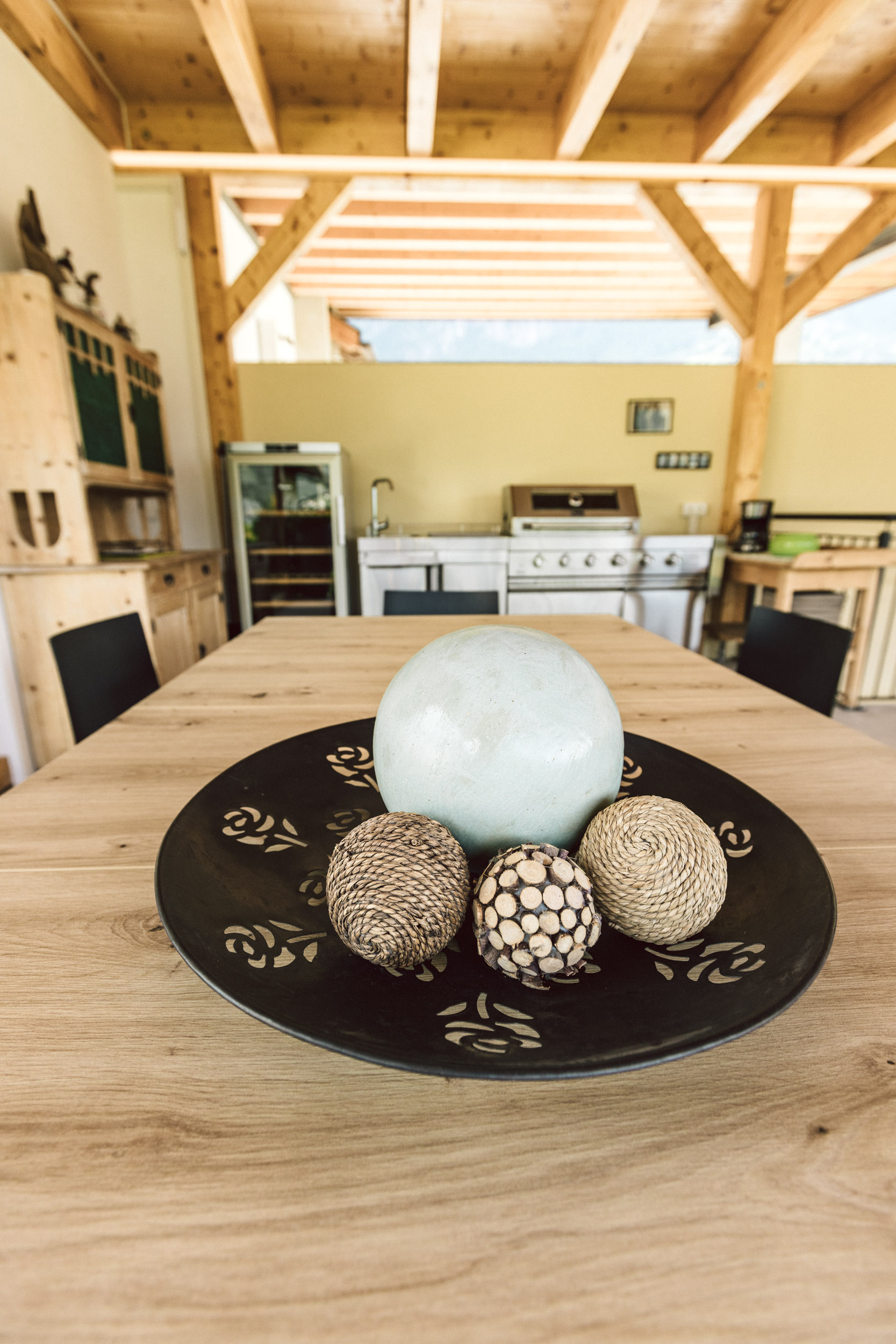 Ein großer Tisch für bis zu 10 Personen steht ebenfalls bereit – einfach vorher anfragen. Direkt am Karcherhof überdacht, bietet die Terrasse Komfort und Atmosphäre für unvergessliche Stunden.